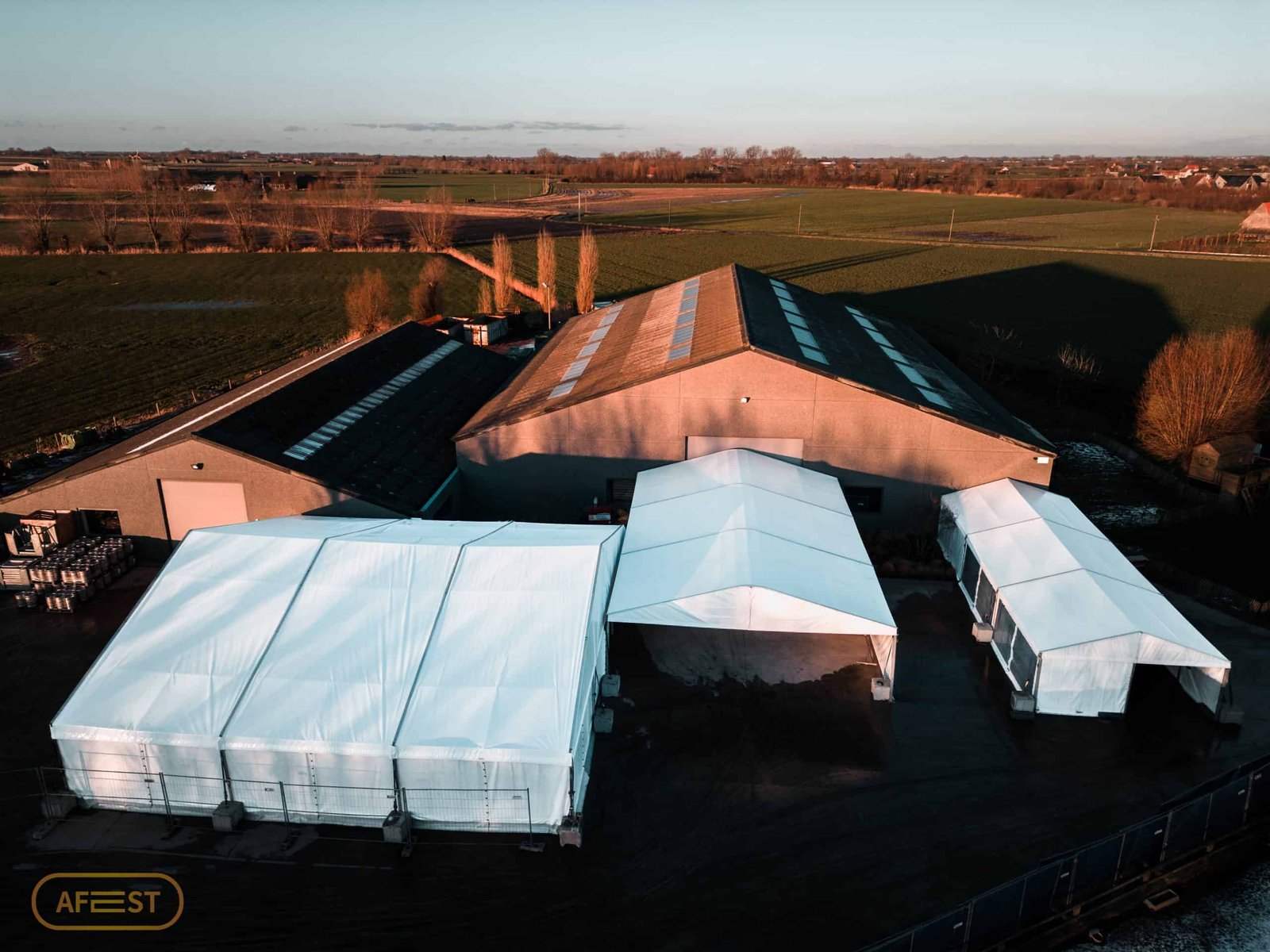 Deze klant heeft gekozen voor een combinatie van drie tenten: 16x15 meter, 10x15 meter, en 6x15 meter. De tenten werden gebruikt als inkomhal, vestiaire en sanitaire stop.